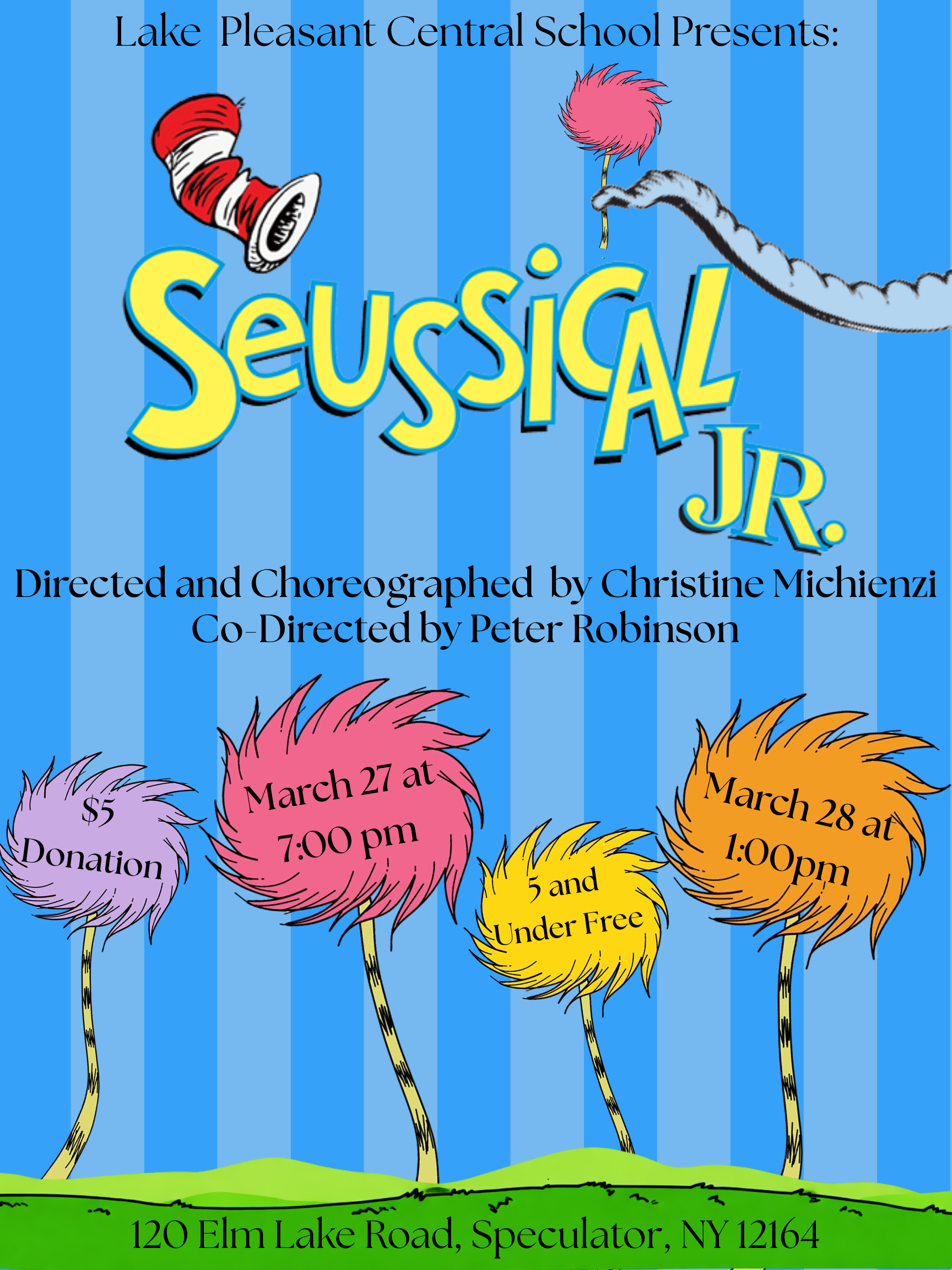 Please join us on March 27th at 7pm and March 28th at 1pm for the production of Seussical The Musical Jr.! This show, narrated by the Cat in the Hat, follows Horton the Elephant as he protects the ...